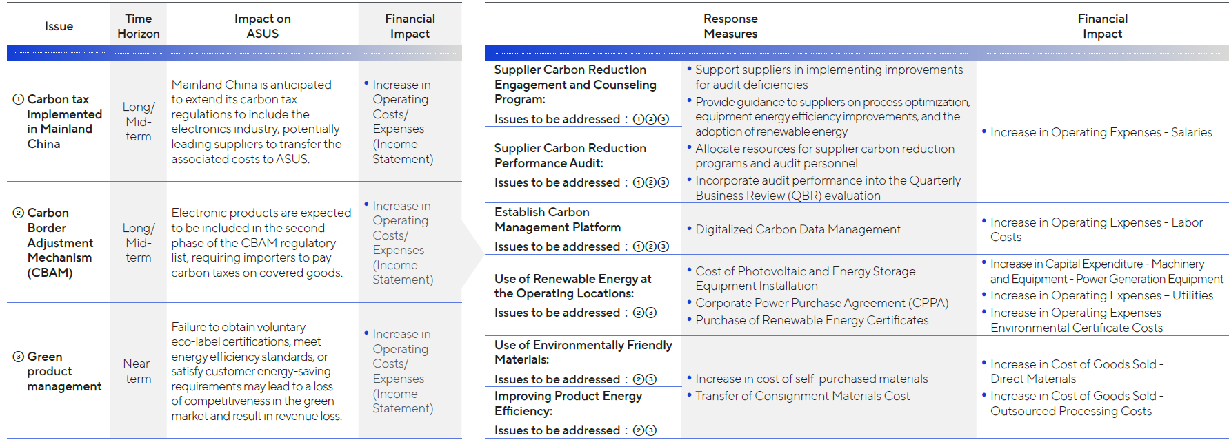 This year, the primary focus was on identifying key risk and opportunity issues within the boundary defined by ASUS’s standalone financial statements. The financial impacts of these issues and their corresponding response measures were evaluated, along with the related accounting items. Please refer to TCFD Report. Going forward, ASUS will expand the boundary of issue assessment and enhance the quantification of financial impacts across short-, medium-, and long-term time horizons.