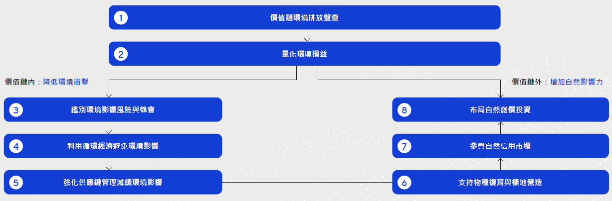 據IPCC 估算,全球生態系服務價值達150 兆美元,其中約有47% 的國內生產毛額的創造是由生物多樣性所產生的服務來提供。然而,生物多樣性和生態系統服務政府間科學政策平台(Intergovernmental science-policy Platform on Biodiversity and EcosystemServices, IPBES)指出,經濟與社會活動是造成自然環境損失的壓力來源,而其中的驅動因子包括:土地與海洋的使用變化(Changes in land and sea use), 氣候變遷(Climate Change)、自然資源的直接利用(Direct exploitation of natural resources)、汙染(Pollution)、外來物種入侵(Invasive species)。企業若能將五大自然環境損失驅動因子納入價值鏈風險評估與管理檢視,將有助於減緩企業價值鏈對環境的影響。