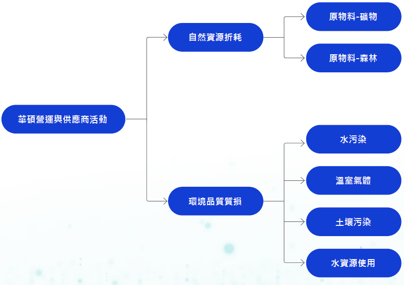 華碩鑑別價值鏈活動對自然資本的影響,依據影響來源可區分為兩大類別:自然資源折耗及環境品質質損。自然資源折耗主要來自原物料開採活動,包括礦物資源開採及森林資源利用等對自然資本存量的直接消耗;環境品質質損則涵蓋營運過程中對環境造成的負面影響,包括水污染、空氣污染、土壤污染,以及水資源使用等對環境品質衝擊。