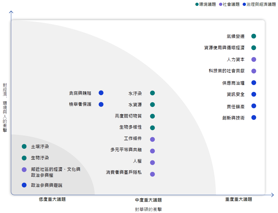 對於重大性議題,華碩建立管理方針與規劃行動方案,並依據數據化衡量策路建立目標與指標,定期追蹤成果。其他非重大性的主題,則依據現有的管理流程與措施,揭露相關指標予利害關係人了解華碩的整體永續成果。